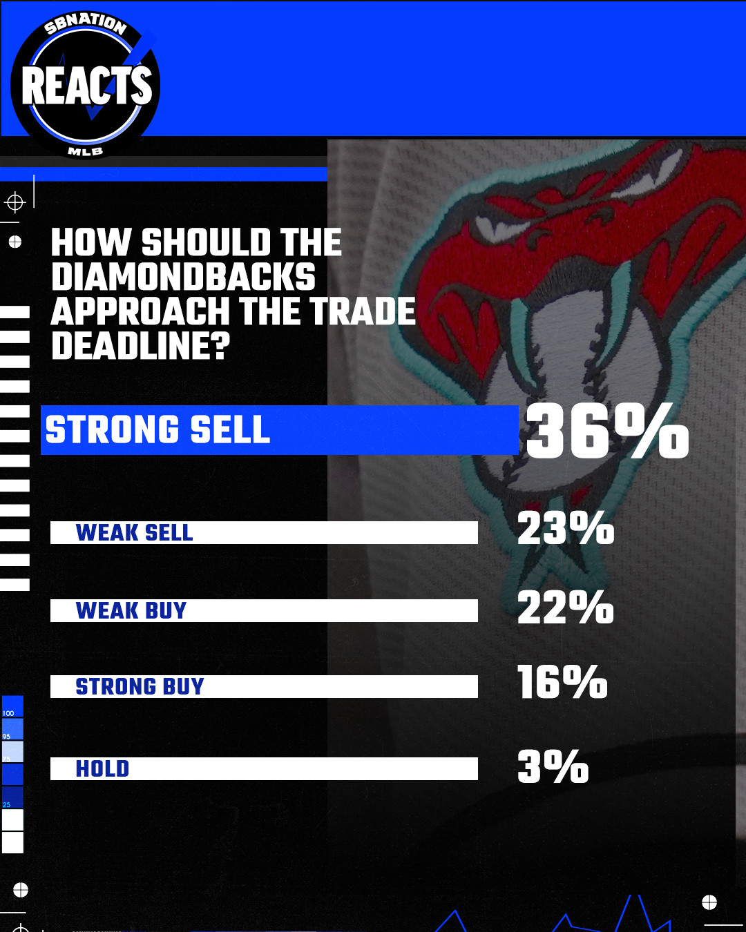 We are into July, and the trade deadline begins to loom, ever more prominently, at the end of the month. But the D-backs' position regarding their strategy for it remains up in the air. They are neither in a wild-card position that would encourage adding to the roster, nor are they so far out of it that selling is the obvious answer. The team's position seems to change on a series-by-series basis, or as we saw in the Giants' set just completed, even within them [We're so back! Oh, wait: we suck again. Never mind...] So, earlier in the week we asked you to tell us what general strategy the Diamondbacks should adopt with regard to this season's trade deadline... Here are the results: