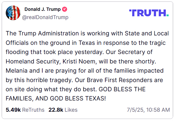 Trump posted on Truth Social earlier in the day about the disaster, writing that the administration is "working with State and Local Officials on the ground in Texas in response to the tragic flooding" and announcing Noem would be on the ground.